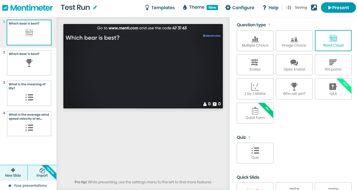 I really like the options that Mentimeter offers that I haven’t seen on other platforms, such as the word cloud and 100 point options. This allows a different variety of assessment options for you as a teacher. It’s a really simple interface and easy to use. All you do is click a couple buttons, and you’re ready to present.