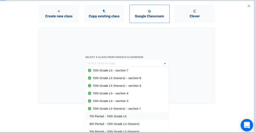 PeerGrade allows you to import classes you may have in Google Classroom or Clever. To do so, click on the appropriate button and then select the class you want to import. (Note: You’ll need to have your Google account or Clever account synced with PeerGrade in the User Settings.)