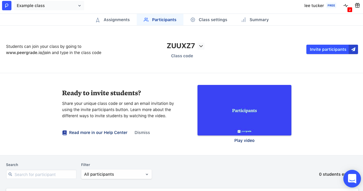 To add new students to a class, you have a couple of options. You can give them a class code by going to the class page and clicking on the Participants tab. You’ll see the code, and students can go to www.peergrade.io/join and type the code in.