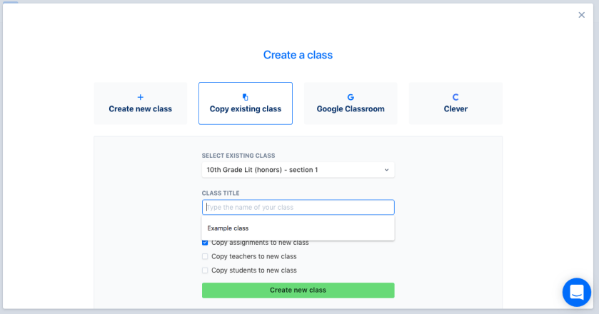 You can copy and existing class if you teach several sections of the same class. Click the class you want to copy from the pulldown menu, give the new class a name, then choose your copy options and click “Create new class”. This option allows you to copy any previously assigned work that you’ve given to the class you’re copying as well.